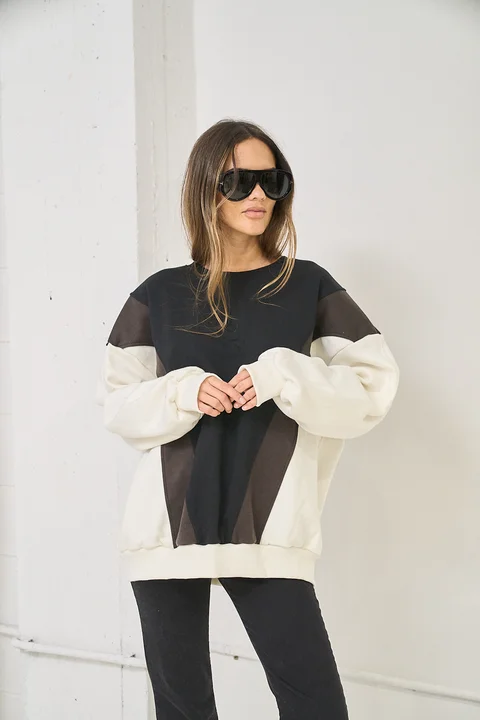 Un diseño que juega con el contraste y la geometría para elevar tu look casual. Este buzo de cuello redondo destaca por su panel frontal en forma de "V", combinando tres tonos neutros que lo hacen extremadamente versátil. Confeccionado en un algodón premium de tacto suave, es la prenda perfecta para quienes buscan comodidad con un toque de diseño diferenciado.